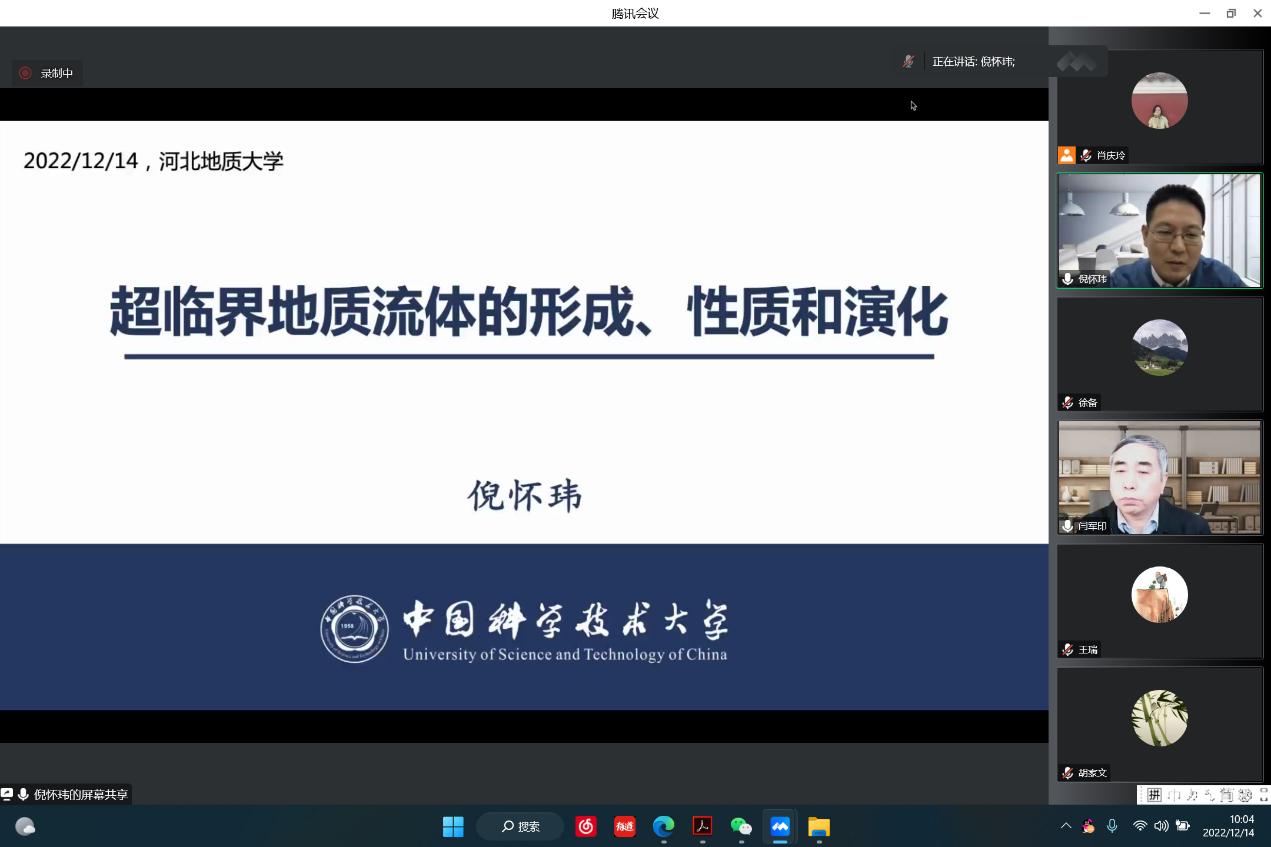 受地球科学学院副院长李英杰教授委托,胡家文教授邀请中国科学技术大学倪怀玮教授于2022年12月14日在腾讯会议上为beat365官网师生作了题为“超临界地质流体的形成、性质和演化”的学术报告。报告会由beat365在线唯一官网登录徐备教授主持。会议开始后,闫军印副校长代表学校发表讲话,对倪怀玮教授的报告表示热烈欢迎和感谢。