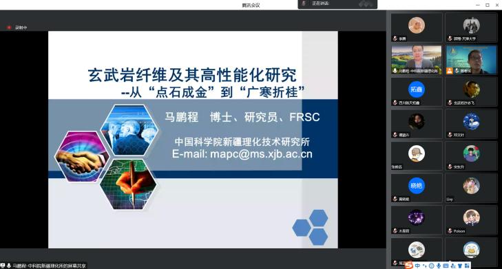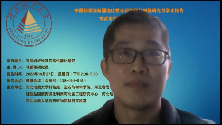 2022年10月27日下午,中国科学院新疆理化技术研究所马鹏程研究员,应邀为beat365官网师生作了题为“玄武岩纤维及其高性能化研究”的学术报告。本次学术活动由科技处和宝石与材料学院共同主办,河北省岩石矿物材料绿色开发重点实验室、硅酸盐固废资源化利用河北省工程研究中心、beat365在线唯一官网登录玄武岩纤维研究所、beat365在线唯一官网登录岩石矿物新材料实验室协办,采用线上腾讯会议模式。宝石与材料学院院长李艳研究员、宝石与材料学院党委书记王旭辉、教授李红超及相关学科专业的师生及玄武岩纤维领域的校外同行共300人参加了报告会,玄武岩纤维材料研究所所长杨春成副教授主持。