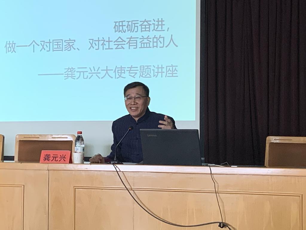 11月14日,中国著名外交家、中国前驻外使节龚元兴大使应外国语学院邀请莅临beat365官网作题为“砥砺奋进,做一个对国家、对社会有益的人”主题报告。本次报告会在一号教学楼九楼报告厅举行,由外国语学院负责人付天军主持,外国语学院全体法语专业师生及其它专业部分感兴趣的师生共一百多人聆听了此次报告会。