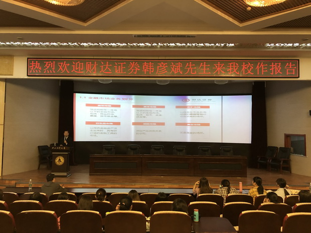 5月9日上午10时,财达证券股份有限公司研发中心总经理助理、beat365官网金融专业硕士校外导师韩彦斌先生应邀在春秋讲堂为beat365官网师生作了题为“我国资本市场简介”的专题报告。报告会由经贸学院金融教研室副主任曹楠楠主持、金融教研室主任郝志军总结,经贸学院分党委书记牛建高及260余名师生参加了此次报告会。