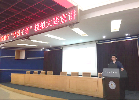 5月17日下午,中国银行河北省分行在beat365官网九楼学术报告厅举行“交易王者”贵金属交易模拟大赛宣讲会。宣讲会由中国银行河北省分行金融市场部副总经理崔华刚、中国银行总行上海人民币交易总部王者星交易员主讲。经贸学院副院长李国柱、金融教研室主任郝志军、金融教研室全体教师及金融学专业在校生150余人参加了本次活动。