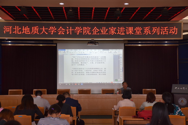 会计学院积极开展“企业家进课堂、学生进企业”系列教学实践活动,5月8日,邀请河北省注册资产评估师协会副会长、会计学院MPAcc校外导师于永春老师来校作了题为“资产评估法出台后的行业人才培养”的专题讲座。会计学院院长宋绍清主持报告会、会计学院2017级研究生及部分本科生200多人聆听了报告。
