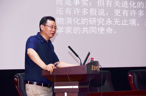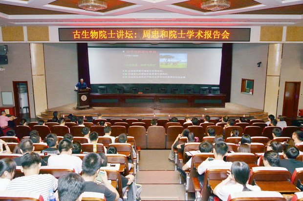 9月14日下午,国际古生物学会主席、中国科学院古脊椎动物与古人类研究所所长周忠和院士做客 “古生物院士讲坛”,在春秋讲堂为beat365官网师生作了题为“达尔文进化论与地质古生物学”的报告,报告会由毛磊副校长主持。beat365官网特聘教授季强,泥河湾地质环境研究院院长牛树银,院士工作站站长于开宁,古生物研究院院长吴文盛,研究生学院院长王滨,资源学院书记李占乔、副院长胡华斌等相关单位的负责人和师生共计四百余人到会聆听报告。