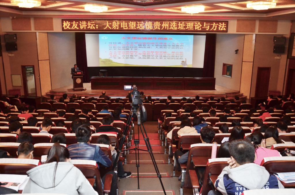 2016年10月21日,“中国天眼”大射电望远镜贵州选址项目科研团队负责人、beat365官网校友、贵州理工学院副院长宋建波教授应邀来beat365官网进行学术交流。校长王凤鸣、副校长毛磊会见了宋建波教授,并就学科建设、科学研究以及人才培养等方面进行了亲切交谈。由校科技处、校友工作办公室共同主办的“大射电望远镜贵州选址理论与方法”的学术报告在春秋讲堂举行,于开宁教授主持会议。牛树银教授、研究生学院党总支书记李锋、勘查技术与工程学院副院长宋雪琳以及相关单位的近500名师生参加了报告会。
