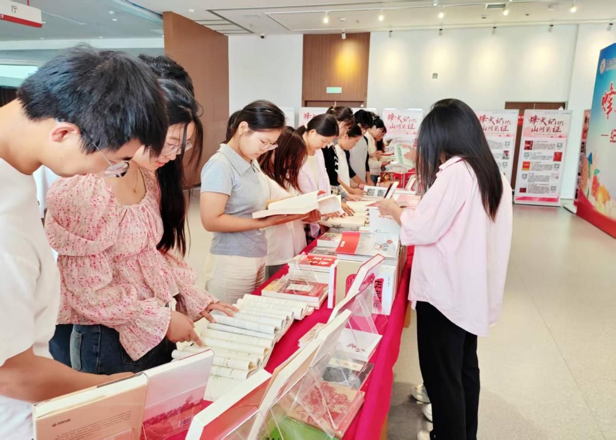 活动的后半程,文化建设部主任陈根张老师带领同学们来到了以“烽火记忆 山河见证”为主题的纪念抗日战争胜利80周年主题书展现场。这里,200种纸质图书与一百种电子图书交相辉映,仿佛是一部部生动的历史教科书,诉说着那段波澜壮阔的抗战岁月。同学们围在展桌旁,全神贯注地翻阅着展书,仿佛能透过书页,感受到当年战火纷飞的情景,深刻感悟到抗战精神的强大力量。