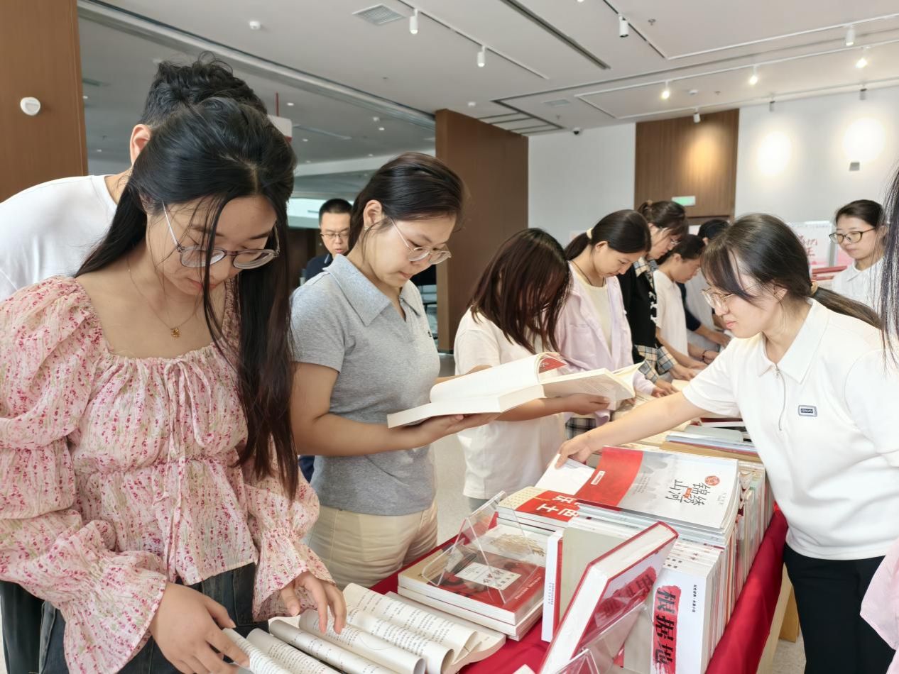 同学们踊跃参与到这次书展活动中。他们穿梭在展桌和展架之间,眼神中充满了敬畏。有的同学拿起一本本著作,仔细地翻阅着,神情专注而凝重;有的同学三三两两地聚在一起,轻声讨论着书中的内容,分享着自己的感悟。在展厅入口,大屏上正播放着纪录片《山河铭记》,那一个个真实的画面、一段段感人的故事,将同学们带回到了那个硝烟弥漫的岁月。