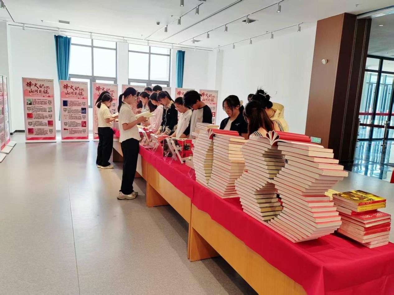 在历史的长河中,有些记忆如同璀璨星辰,警示着后人;有些精神如同巍峨高山,激励着世代。为纪念中国人民抗日战争胜利80周年,铭记那段可歌可泣的悲壮历史,传承和弘扬伟大的抗战精神,图书馆精心策划并举办了以“烽火记忆,山河见证”为主题的专题书展活动。
