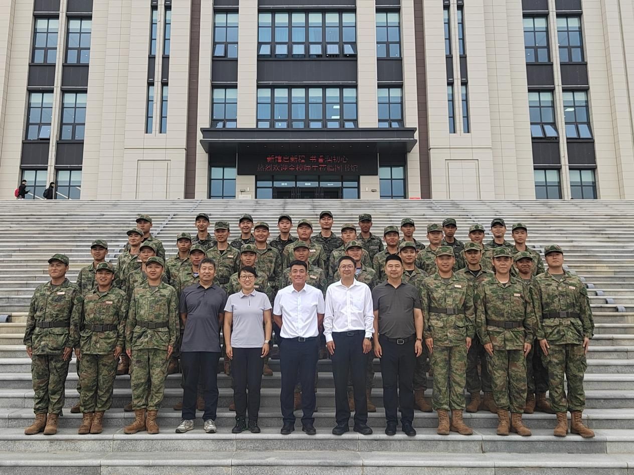 定兵入伍人员与新校区学生工作处领导、校友办负责人及优秀校友在图书馆前合影留念