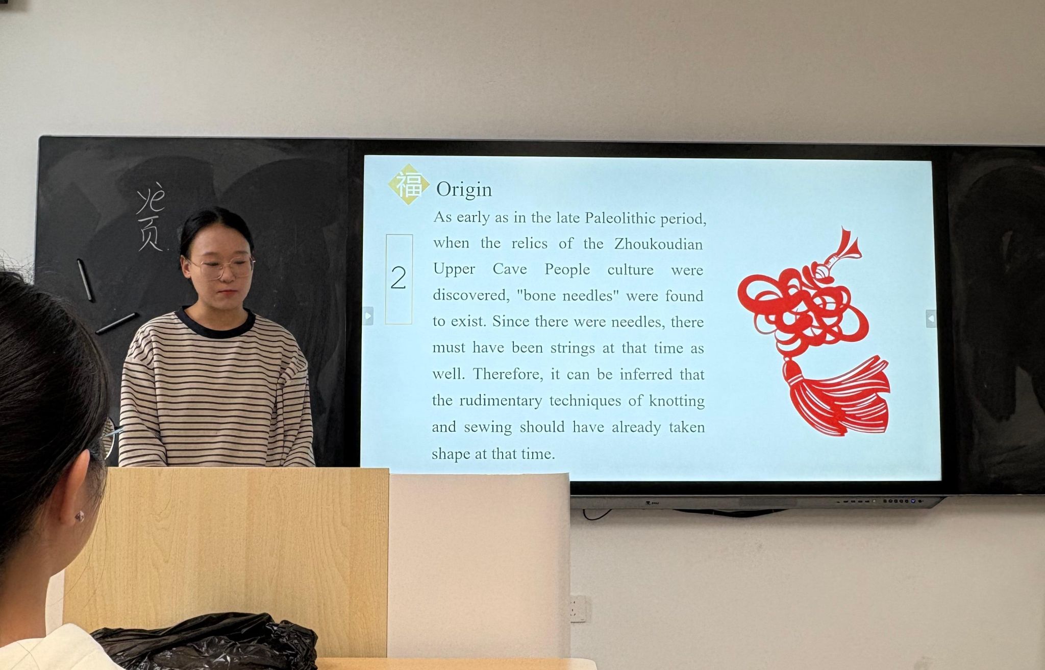 活动伊始,汉语国际教育专业的学生作为文化讲解员,向来华留学生们介绍了中国结的文化内涵。从中国结的历史渊源出发,详细讲解了其在不同朝代的发展演变,以及“同心结”“吉祥结”等不同款式所承载的团圆、祈福等美好寓意,让留学生们对这一传统手工艺有了初步的文化认知。
