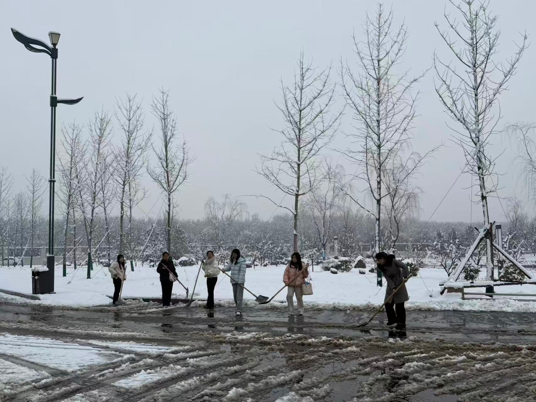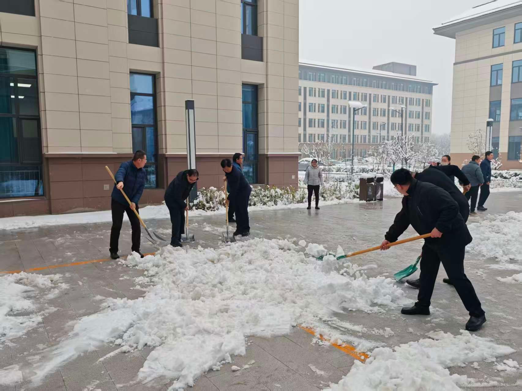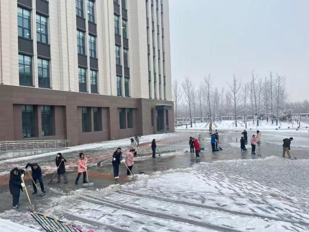 为确保道路畅通、保障师生安全,学校教职工迅速集结,拿起铁锹、扫帚,投入扫雪除冰行动。大家不畏春寒,分工协作,对主干道、教学楼、办公楼等重点区域集中清理。铁锹铿锵,扫帚沙沙,忙碌的身影在雪地里汇成一道暖流。