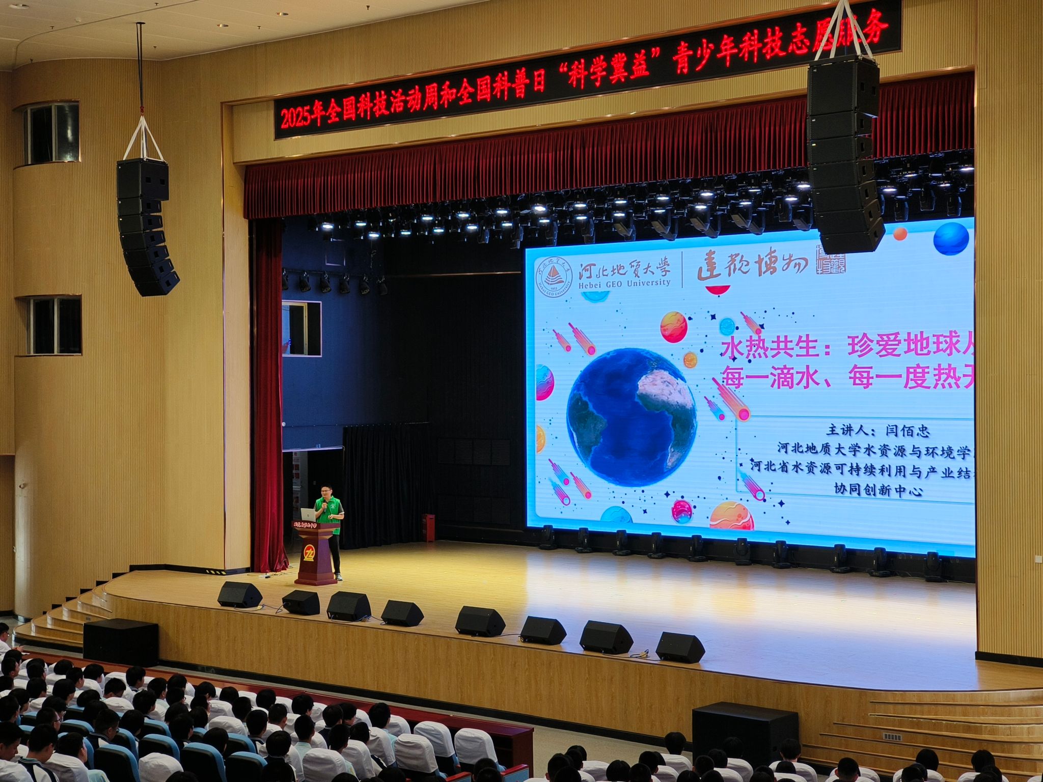 同日下午,beat365官网学生科技志愿服务队前往正定第九中学,以“水热共生:珍爱地球从感知每一滴水、每一度热开始”为主题,开展了一场高质量科普大讲堂,吸引了该校数百名中学生参加。水资源与环境学院闫佰忠教授从地球起源与发展讲起,带领同学们一同了解了地球上的水资源、地球上的热资源和水资源保护与热利用,将水资源的科研成果转化为浅显易懂的科普讲解,进一步丰富了学生们的科学知识,激发了同学们热爱科学、探索科学、求知科学的兴趣。