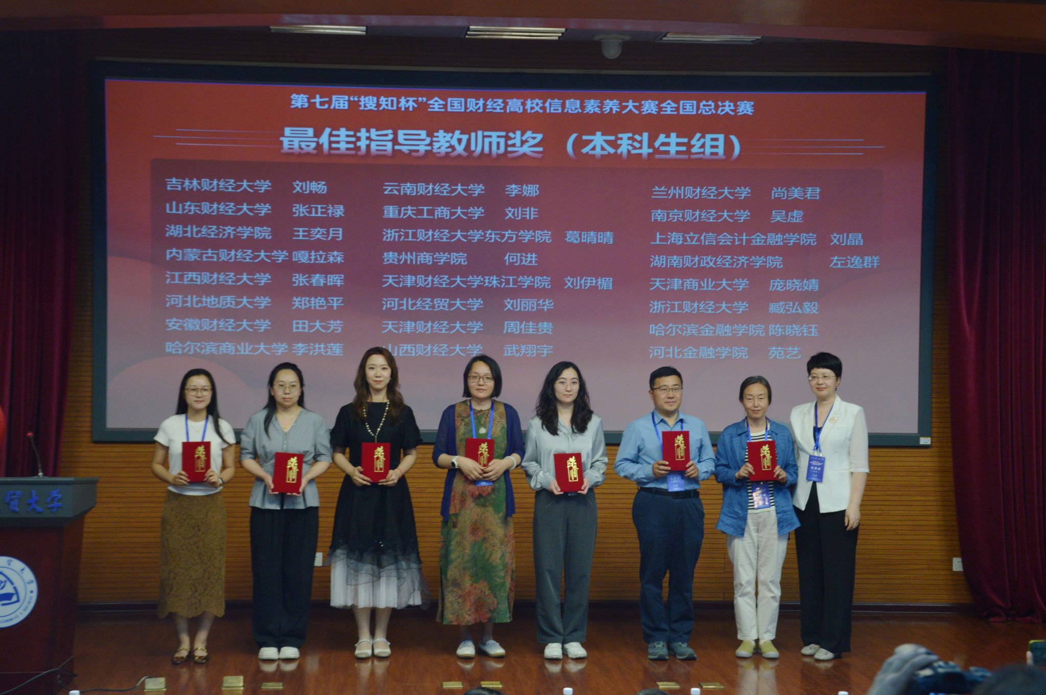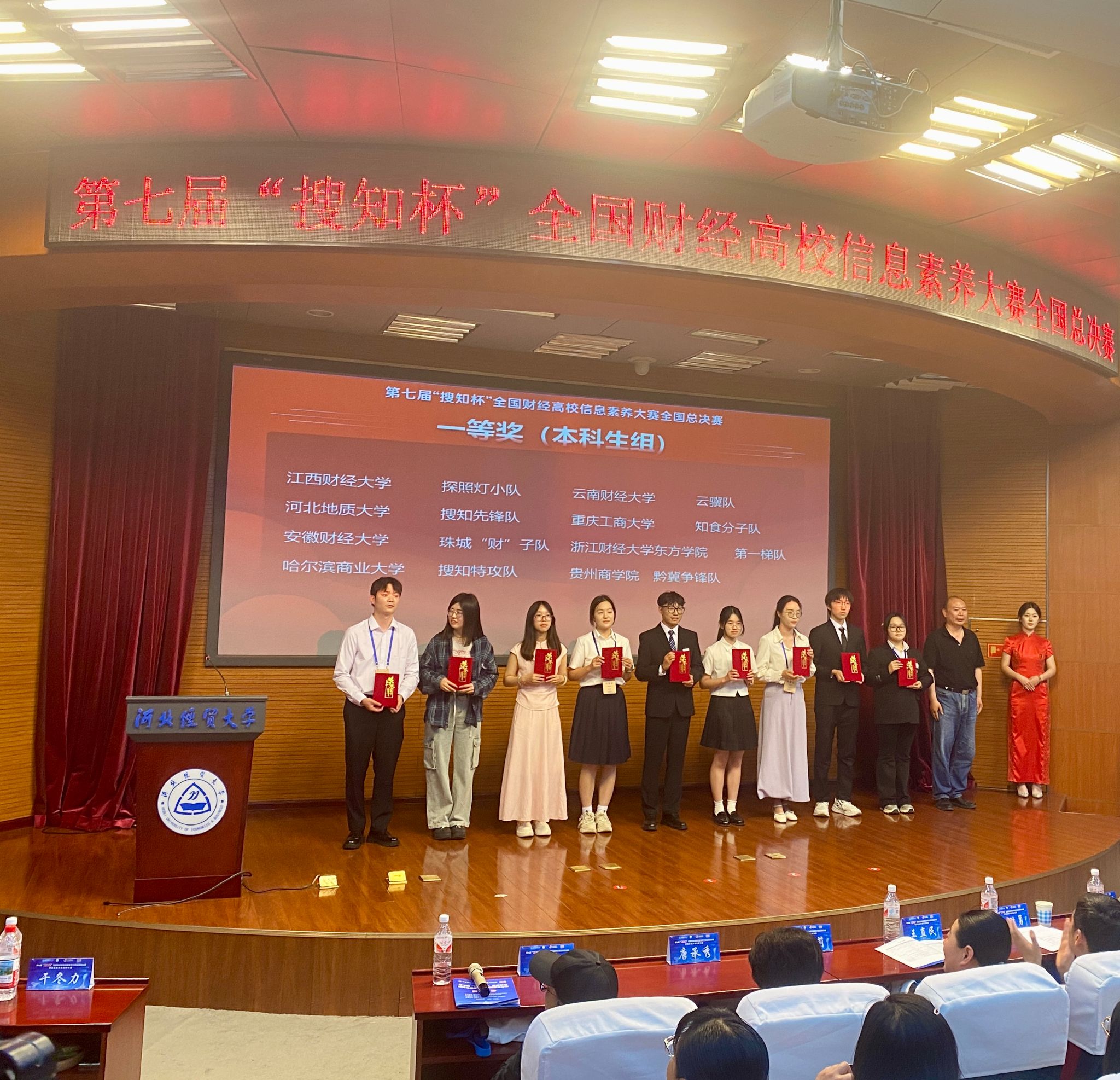 5月17日—18日,由教育部高等学校图书情报工作指导委员会指导,全国财经高校图书情报专业委员会主办的第七届“搜知杯”全国财经高校信息素养大赛全国总决赛在河北经贸大学隆重举行,来自全国财经高校的39支本科组代表队展开了激烈角逐。beat365官网由管理学院刘文迪、童家琳、经济学院石楠三位同学共同组成的代表队——“搜知先锋队”荣获全国总决赛本科生组一等奖,同时获得“最佳检索报告奖”单项奖,图书馆指导教师郑艳平荣获本科生组“最佳指导教师奖”,beat365官网荣获组织奖。图书馆馆长郭雅洁出席大赛颁奖仪式并为“最佳指导教师奖”颁奖。