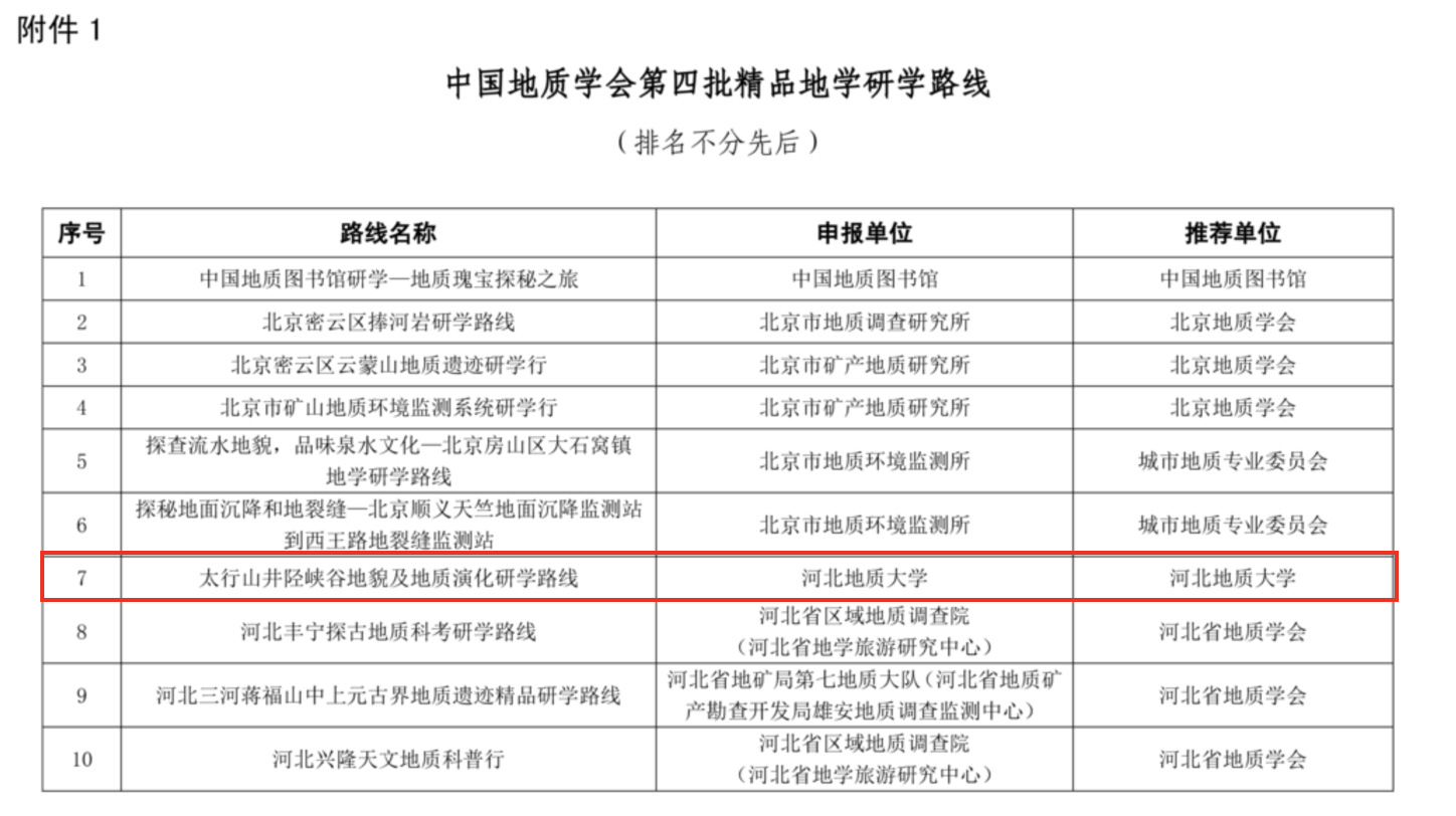 近日,中国地质学会发布通知,公布了全国第四批精品地学研学路线、第三批精品地学研学课程和第五批地学科普研学基地(营地)名单。地球科学学院申报的“太行山井陉峡谷地貌及地质演化研学路线”成功入选。