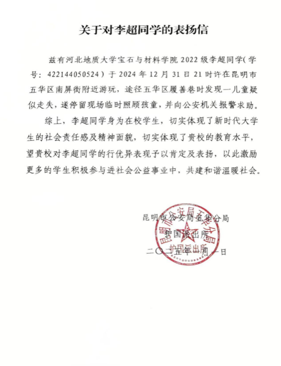 近日,宝石与材料学院的学子李超在平凡的日子里展现出了不平凡的担当,以实际行动传递了温暖与正能量,其热心助人的事迹,通过昆明市公安局五华分局护国派出所的一封表扬信向我们展示出来。