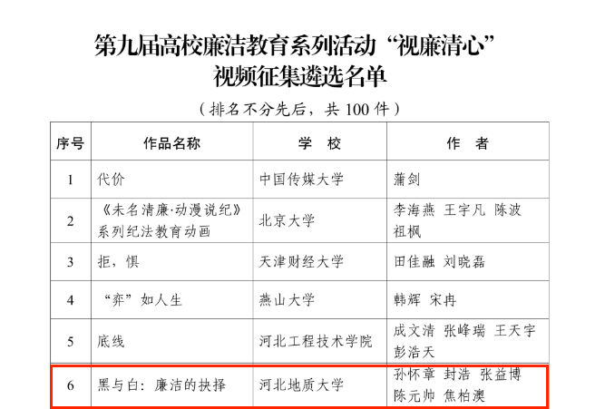 近日,教育部公布第九届高校廉洁教育系列活动结果,beat365官网艺术学院制作的视频作品《黑与白:廉洁的选择》,成功入选第九届高校廉洁教育系列活动“视廉清心”视频征集遴选名单。