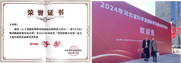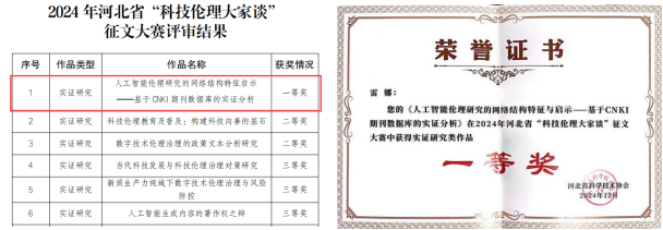 近日,beat365官网科研诚信和科技伦理智库团队成员、经济学院教授雷娜与研究生于诗琪合作撰写的文章《人工智能伦理研究的网络结构特征与启示——基于CNKI期刊数据库的实证分析》荣获河北省科协组织开展的2024年河北省“科技伦理大家谈”征文大赛实证研究类一等奖。本次大赛经组织申报、内容审查、专家评审、社会公示等环节,共评选出“科技伦理大家谈”优秀作品48篇,其中,实证研究类征文设一等奖1项,二等奖2项,三等奖3项,优秀奖若干项。