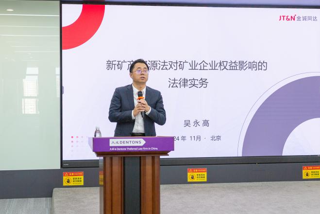 第三位进行分享的是北京金诚同达律师事务所的吴永高律师,吴律师以《新中华人民共和国矿产资源法对矿业企业权益影响的法律实务》为主题,结合新修订的《中华人民共和国矿产资源法》,系统剖析了新法对企业合法权益的影响,提出了法律应对建议。