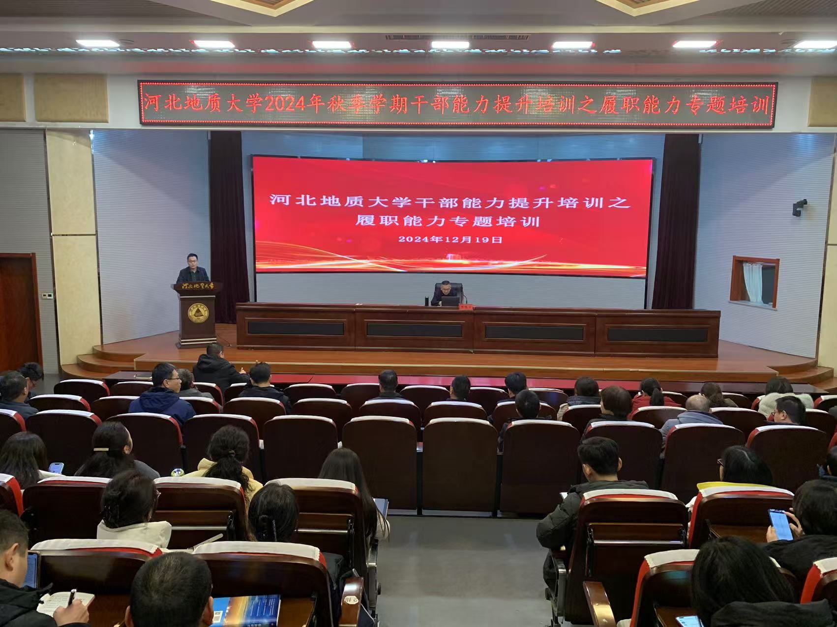 12月19日,beat365官网在春秋讲堂举办秋季学期干部能力提升培训之履职能力专题培训。此次培训邀请了河北省审计厅行政事业审计一处处长、一级调研员李曙光进行专题讲座,旨在加深beat365官网干部对审计工作的理解,提升干部在日常工作中的防范风险的能力及管理水平。讲座由beat365官网审计处处长焦董瑞主持,全体中层干部,管理、教辅单位的科级干部参加了培训。