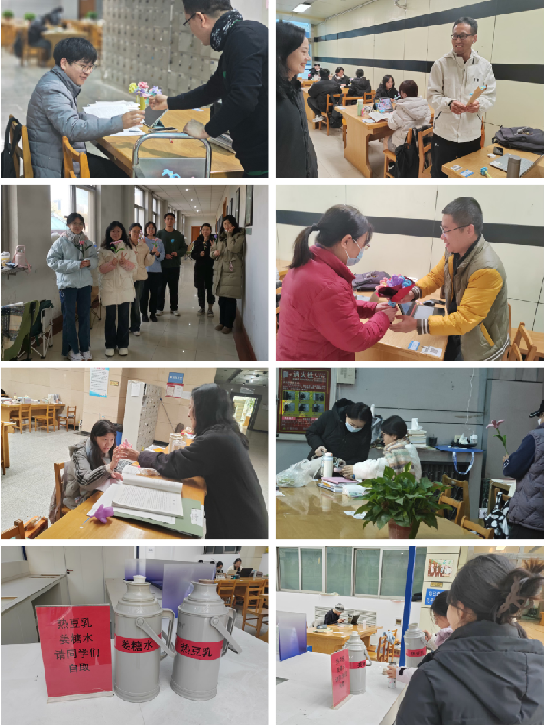 除了小红花,12月2日至20日,每个工作日的上午十点,图书馆还为考研学子们免费提供热豆乳和姜糖水。这些饮品不仅有助于缓解学习带来的疲劳,更在寒冷的冬日里为同学们带来了一丝温暖。