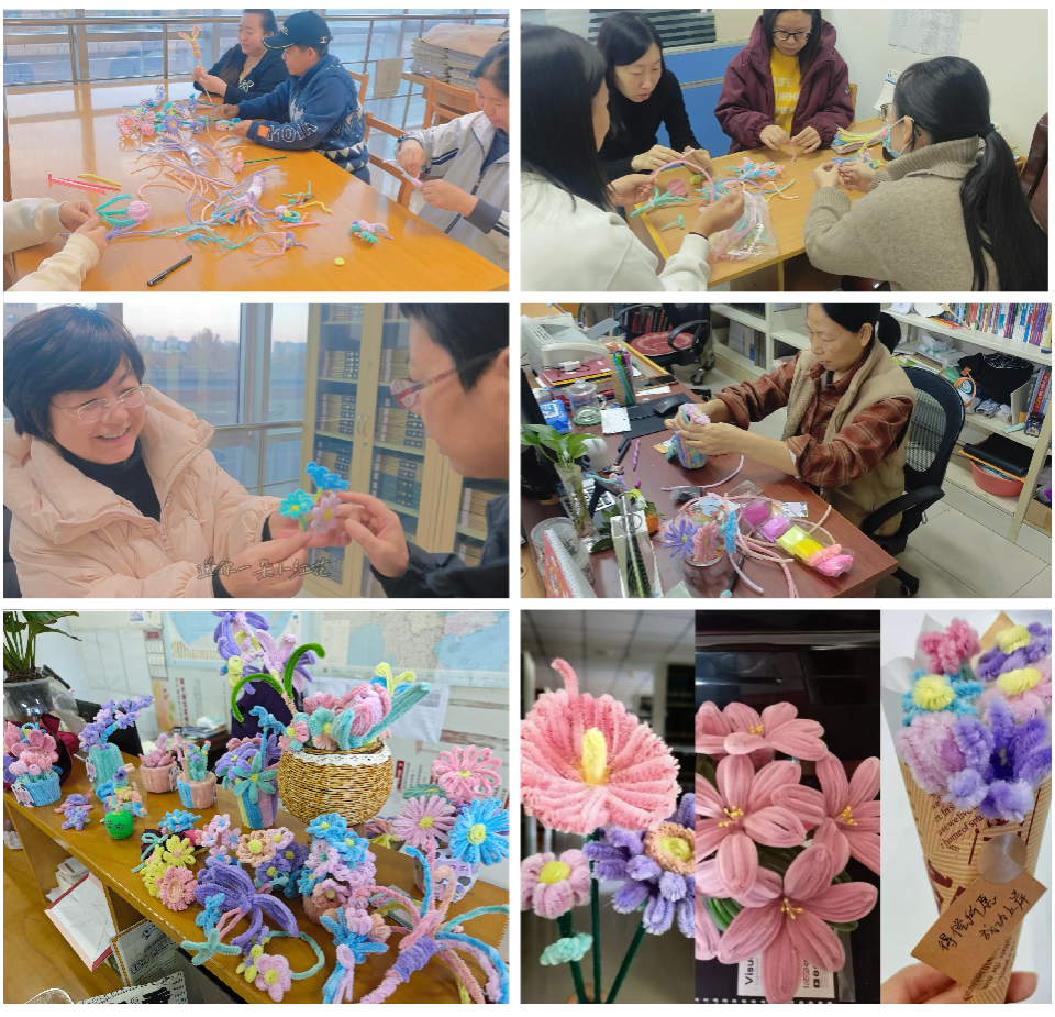 本次活动的筹备期间,图书馆的老师们便投入了大量的心思与精力。他们精心挑选了颜色鲜艳、质地柔软的扭扭棒,研究了多种花朵的制作方法,力求每一朵花都能展现出最完美的形态。在制作过程中,老师们更是倾注了满满的爱意与祝福,每一片花瓣、每一片叶子都经过细心雕琢,他们对考研学子的美好祝愿都凝聚在这一朵朵的小红花中。