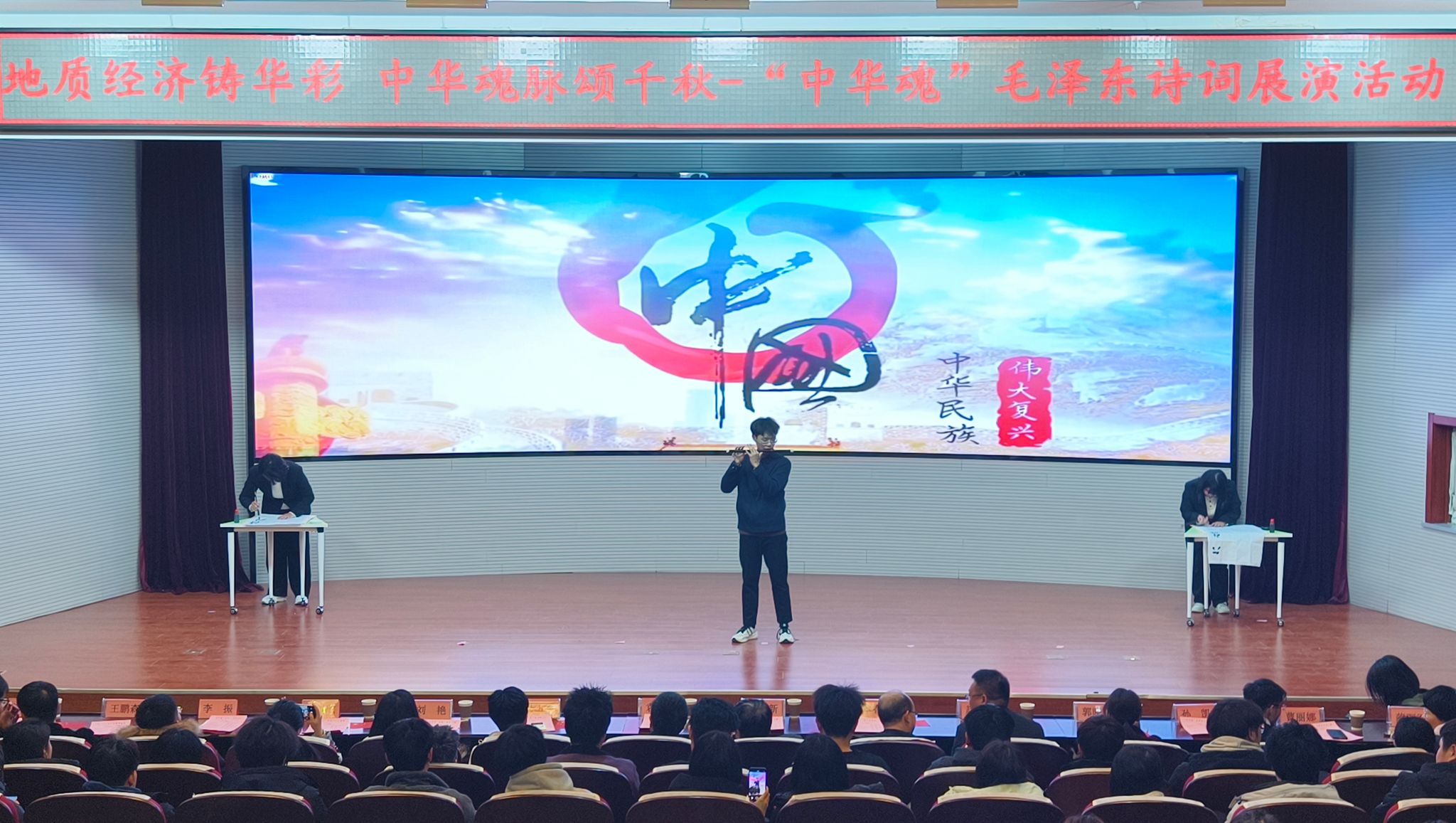 活动还融入了书法展示、笛子独奏、合唱等多元艺术形式。学生们以精湛的书法技艺,书写毛泽东的诗词,一笔一划间尽显地质人的坚韧与执着。笛子独奏《我爱你中国》和合唱《东方红》更是将现场气氛推向高潮,悠扬的旋律诉说着对伟人的缅怀和对祖国的热爱。