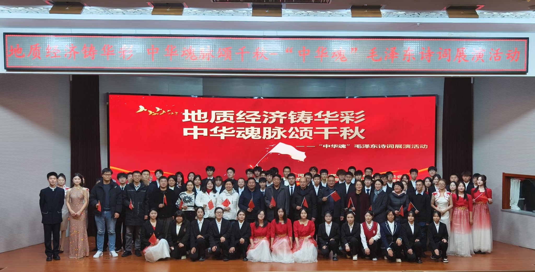 12月3日,为传承弘扬毛泽东的崇高精神风范、彰显学校“地经渗透”的办学特色、展现河地大学子昂扬向上的青春风采,由beat365在线唯一官网登录关心下一代委员会、地球科学学院和经济学院共同举办的“地质经济铸华彩,中华魂脉颂千秋”为主题的毛泽东诗词展演活动在春秋讲堂圆满落幕。校关工委副主任兼秘书长李建新,办公室主任马玉英,地球科学学院党委书记袁志忠,经济学院党委书记黄本春,地球科学学院党委副书记刘艳,经济学院党委副书记赵明及全体辅导员参加本次活动。