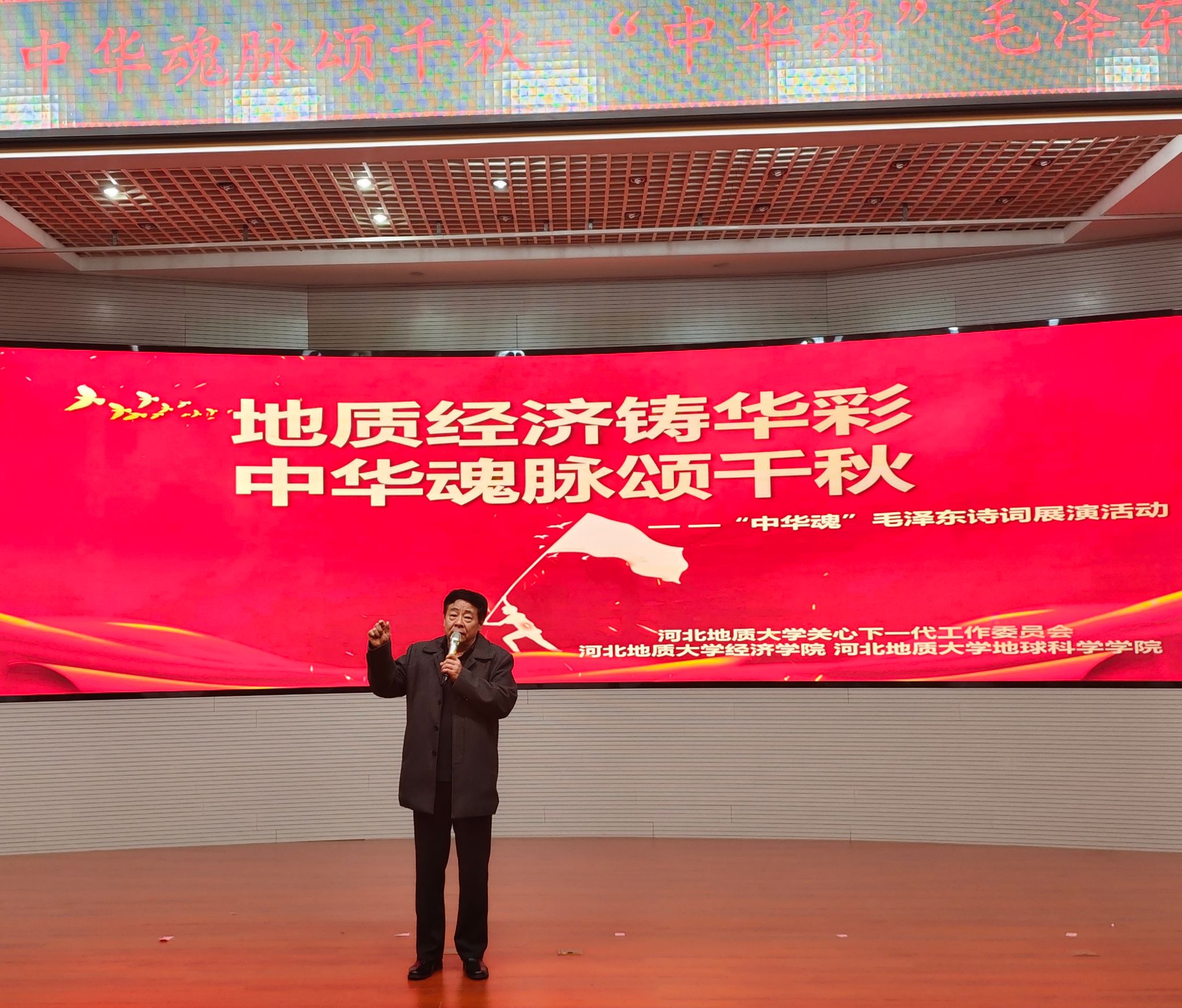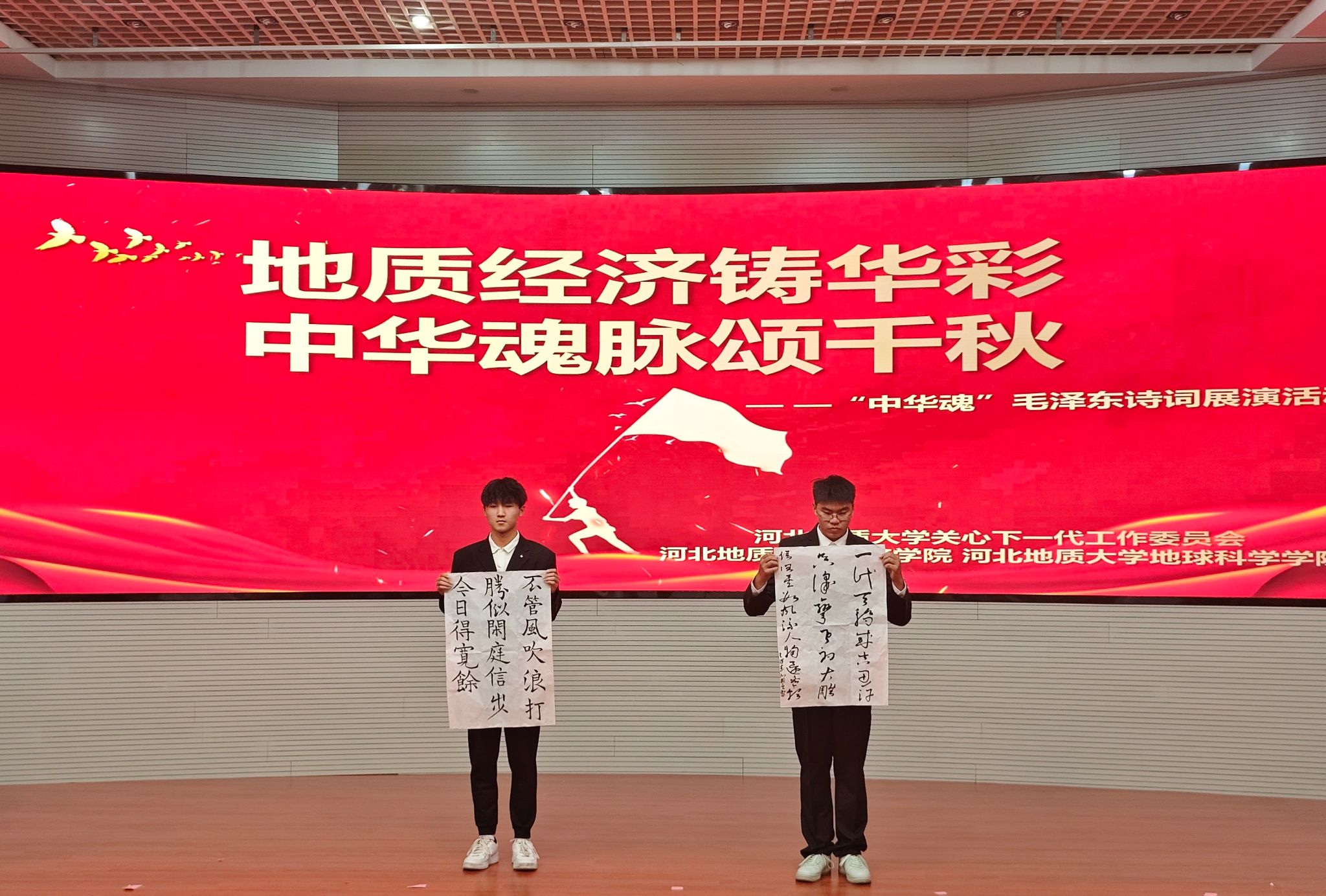 活动现场,伴随着激昂的音乐,学生们深情朗诵着毛泽东的经典诗词,每一句诗词都饱含深情,震撼人心。特别是《沁园春·雪之地经华章》、《吟伟人诗词,承地质精神》等节目,将毛泽东的诗词与地质经济相结合,用诗词的力量描绘出地质与经济交织的壮丽画卷。