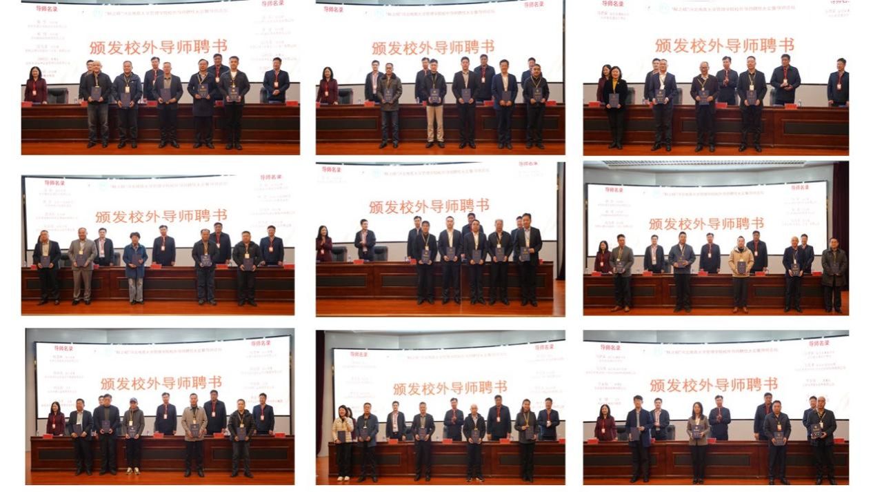 聘任仪式上学校领导和学院负责人为校外导师颁发聘书并合影留念