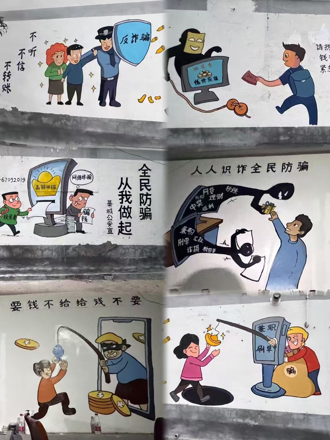 墙绘作品内容丰富、形式多样,既有活泼可爱的卡通人物,也有简洁明了的防骗标语。一幅幅色彩鲜艳、形象生动的画面跃然墙上。同时,还巧妙地融入了网络安全和反诈骗的相关知识,让村民们在欣赏画作的同时,也能学习到防骗技巧。