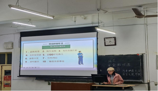 10月18日,在教学三号楼210教室举办了面向全体学生的安全知识宣讲会。由学院2023级学生张文华、张宝仪主讲。宣讲会通过一系列生动具体的案例和深入浅出的讲解,让与会学生深刻认识到日常安全的重要性,并掌握基本的消防知识,提高网络安全、食品安全和反诈骗的意识。