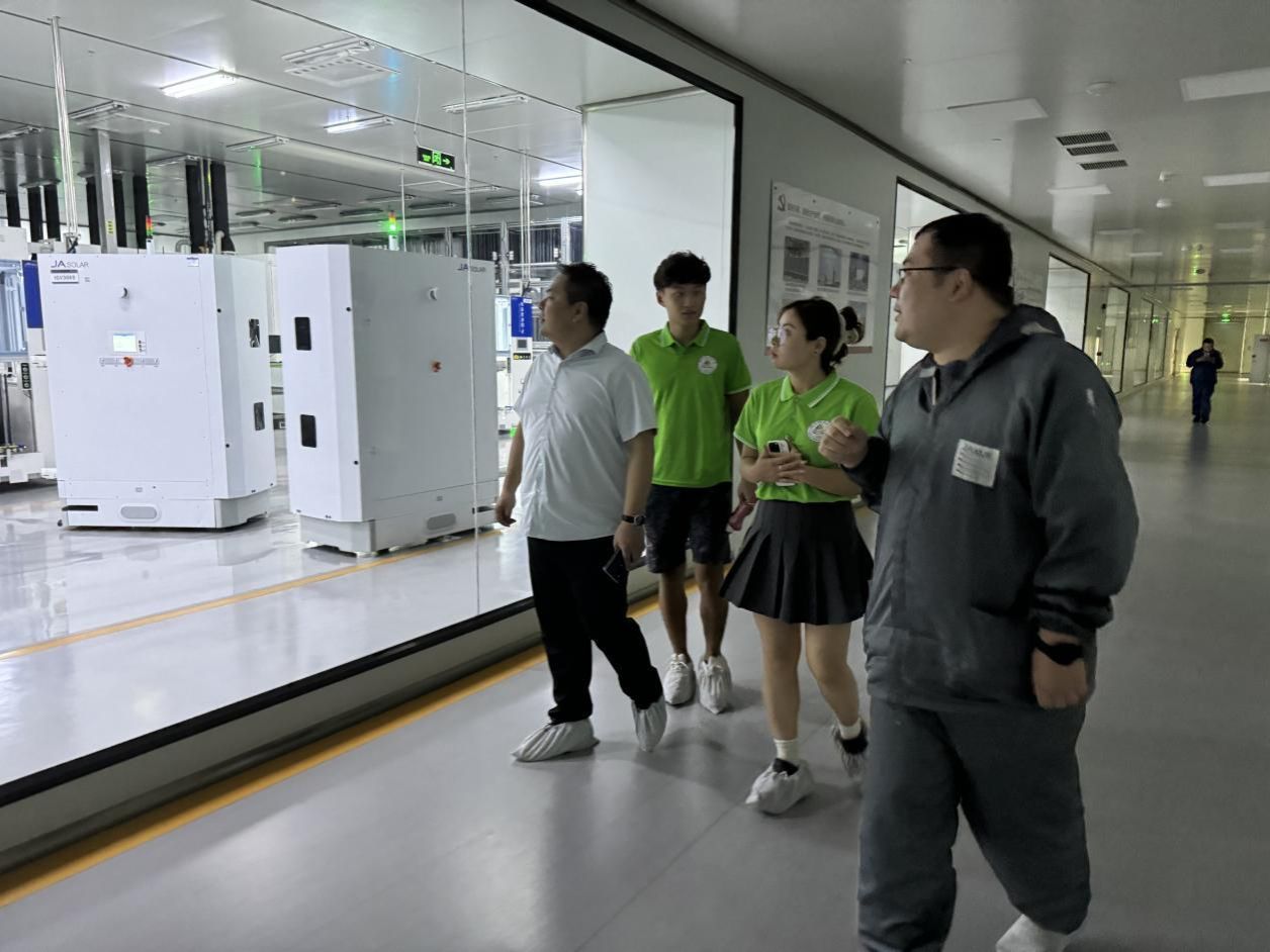 座谈会后,实践团队在厂区两位高级工程师的带领下,参观了晶澳太阳能的生产车间。宽敞明亮的车间内,全自动智能制造生产线有序运转,智慧型引导运输车来回穿梭,全自动生产设备高效地完成着各项操作。师生们近距离观察了光伏电池的生产流程,包括硅片的切割、电池的制备、组件的封装等环节,深刻感受到了光伏产业的高科技含量和高效生产能力。