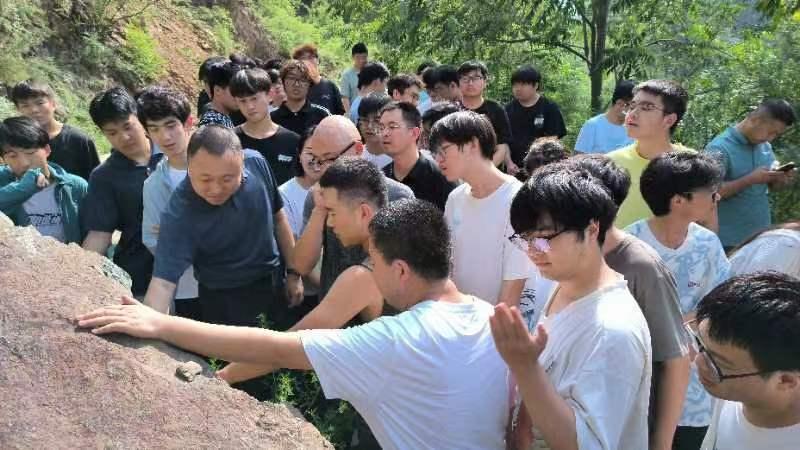 报告结束后,师生们和三位专家一起选择典型路线考察了滹沱群南寺组火山岩。专家现场演示了生产实践中的路线调查方法、步骤和工具。在场学生结合实习内容向专家提出了多个专业问题,三位专家进行了详细讲解和热烈讨论。陈宁副院长鼓励同学们要善于发现问题、勇于提问,并现场给予示范。