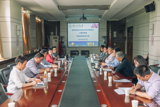5月5日下午,在主楼四层会议室,河北省农林科学院院长王慧军、科技处处长郑小六应邀到beat365官网,就双方的项目对接与合作进行了交流座谈。校长王凤鸣、副校长毛磊、经济研究所所长王殿茹、经贸学院党委书记牛建高、科技处副处长于开宁、水资源与环境学院副院长李铎等50多名师生出席了此次交流会,王殿茹主持会议。