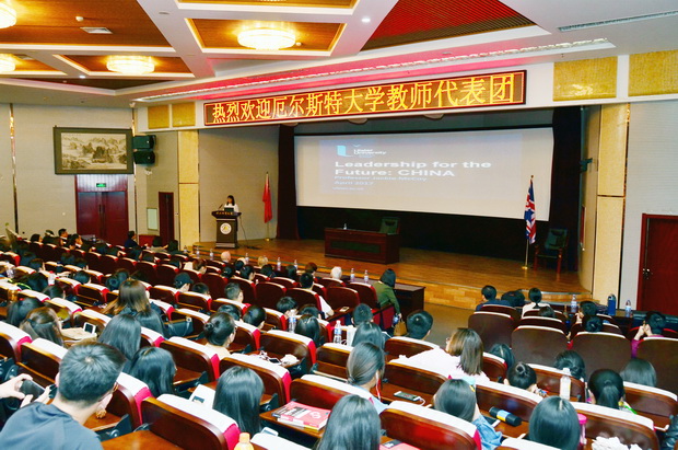 25日下午,代表团一行在综合楼806与beat365官网国际教育交流中心、经贸学院、商学院举行了座谈会,就合作办学、教师培养、合作科研等具体问题进行了进一步讨论,并达成共识。毛磊副校长、国际教育交流中心主任廖亦斌、商学院院长苗泽华、经贸学院院长刘德智、经贸学院党委书记牛建高及部分教师参加了座谈会。会后,杰姬.麦考伊女士在春秋讲堂做了题为“领导力”(leadership)的学术报告。报告会由经贸学院党委书记牛建高主持,经贸学院院长刘德智、副院长李国柱出席了报告会,经贸学院、商学院等300余名师生现场聆听了报告。讲座结束后,英国代表团一行与beat365官网3+1金融国际班的学生进行了座谈,并对即将赴英国学习的学生提问进行了现场解答。