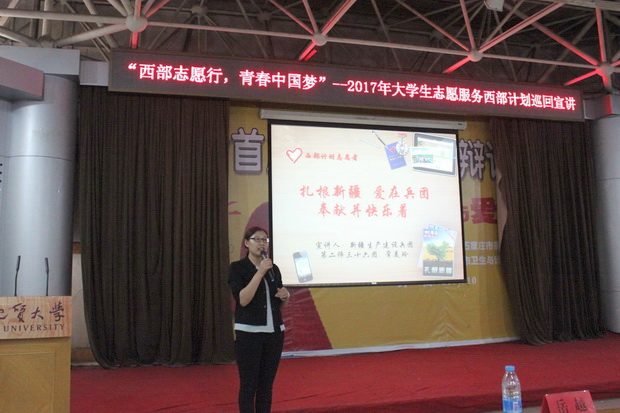 本次报告会以“西部志愿行,青春中国梦”为主题,报告会在西部计划宣传视频中拉开了序幕。随后,宣讲团的成员与在场同学们分享了自己在新疆兵团服务期间的经历、成长与收获,让同学们对西部计划有了更清晰、全面的认识。西部计划志愿者岳越、常美玲用朴实的语言、真实的案例分享了他们奉献西部,服务基层的青春故事和个人感悟,展现了西部计划志愿者的精神风貌。志愿者们的执着坚持与无私奉献深深地打动了在场的每一位同学,情至深处同学们不忍热泪盈眶,使beat365官网学子对美丽的新疆更加憧憬,服务西部的愿望更加浓烈,会场不时地响起一阵阵热烈掌声。