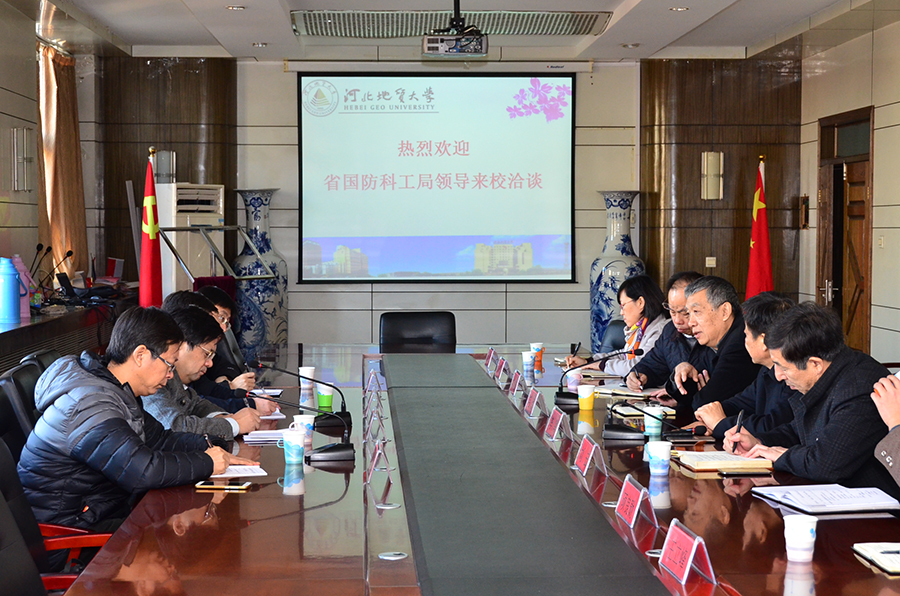 2016年12月22日上午,河北省国防科工局局长徐振川率该局军民结合推进处副处长封永存、系统规划科技处副处长柳萌、综合处副主任科员薛龙来beat365官网洽谈军民融合、军地军校对接、整合资源,合作发展的相关对接工作。洽谈会在主楼四楼会议室举行。党委书记李军、副校长毛磊、科技处处长刘云、教务处副处长刘翠娥、光电信息研究所所长亢俊健、资源学院副院长王立峰、勘查技术与工程学院副院长袁颖、网络信息安全实验室主任硕良勋等参加了座谈会。