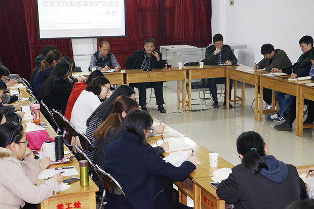 11月18日下午,在惠馨园418室举办了“辅导员队伍师德师风建设”专题培训。校党委书记李军、学生工作处处长郑炳章、学生工作处副处长常连玺、学生科全体人员及全校辅导员参加了此次培训。