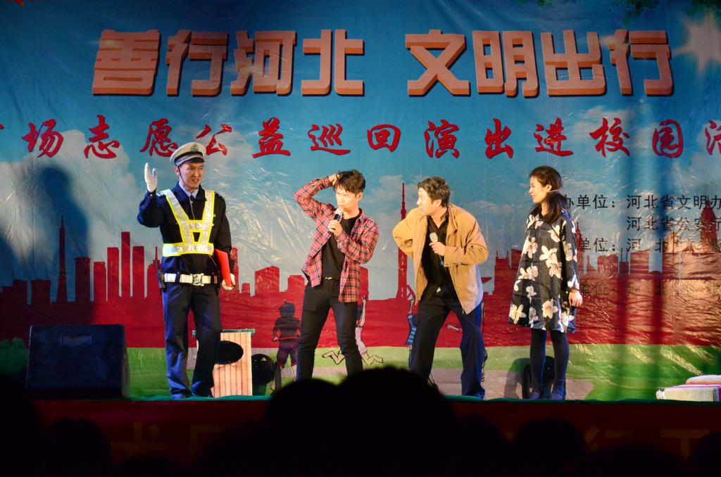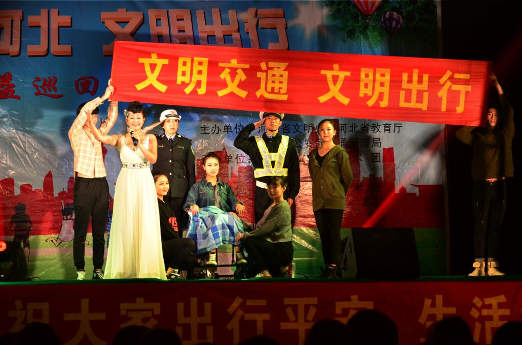 10月19日晚,由省文明办、省教育厅、省公安交管局主办,河北省交警艺术团承办的“善行河北,文明出行”志愿公益巡回演出活动在beat365官网北校区举行。河北省交警艺术团围绕宣传交通安全知识、交通法规为主题,以学生喜闻乐见的形式,通过歌曲、小品、相声等艺术形式,向学生们开展交通安全宣传教育。北校区学生观看了演出。