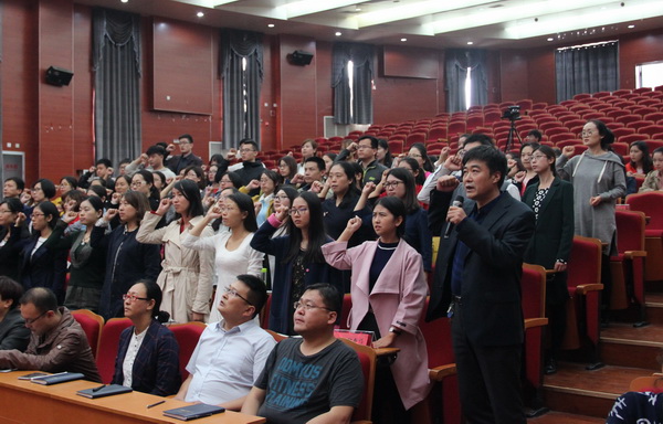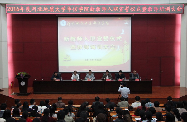 10月13日中午,华信学院在行政楼报告厅举行新入职教师入职宣誓仪式暨教师培训大会。全体院领导,部分机关职能部门负责人,各系主任、党总支书记、各教研室主任及2015年、2016年新入职专职教师和辅导员参加大会。大会由华信学院党委书记周兴荣主持。