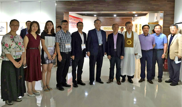 展览开幕式上,beat365官网教师与圆光大学校长金道宗教授(左六)、圆佛教理事(右四)、孔子学院院长刘向前教授(右三)、对外交流处郑秀镇处长(右一)等人合影