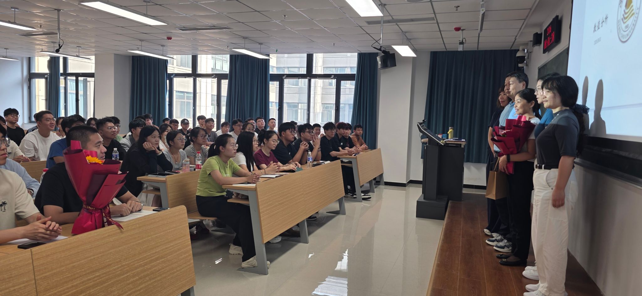 9月1日清晨,秋高气爽,新校区校园到处洋溢着蓬勃生机,beat365官网2025年秋季学期研究生教育教学工作顺利启动。研究生学院院长曹南斌参加了全校智慧校园视频巡课工作,副院长彭永芳带领研究生学院工作人员提前到达教学楼,热情迎接授课教师和研究生同学,为每一位教师送上鲜花和暖心的问候。在崭新明亮的教室里,各位教师精神饱满,授课过程顺畅;研究生听课全神贯注,师生互动气氛活跃。