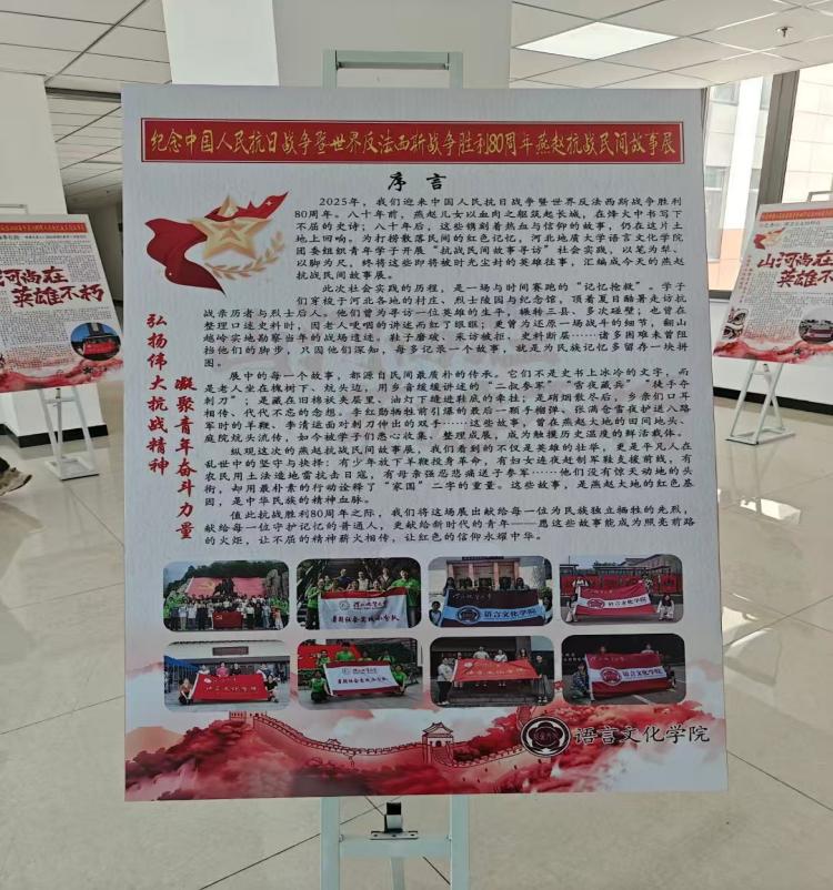 为纪念中国人民抗日战争暨世界反法西斯战争胜利80周年,9月3日上午,燕赵抗战民间故事展在1号学院楼A座1楼大厅成功举办。活动由语言文化学院主办,是学院坚持党建引领,文化赋能,充分发挥“一站式”学生社区的优势,以党建带动团建的重要举措,旨在深入挖掘燕赵大地红色文化资源,传承抗战精神,在青年学子心中厚植爱国情怀。学校党委副书记都沁军、王彦东,团委书记马沁芳、学生工作处处长王祥、语言文化学院领导和学院师生代表作为首批嘉宾观展。