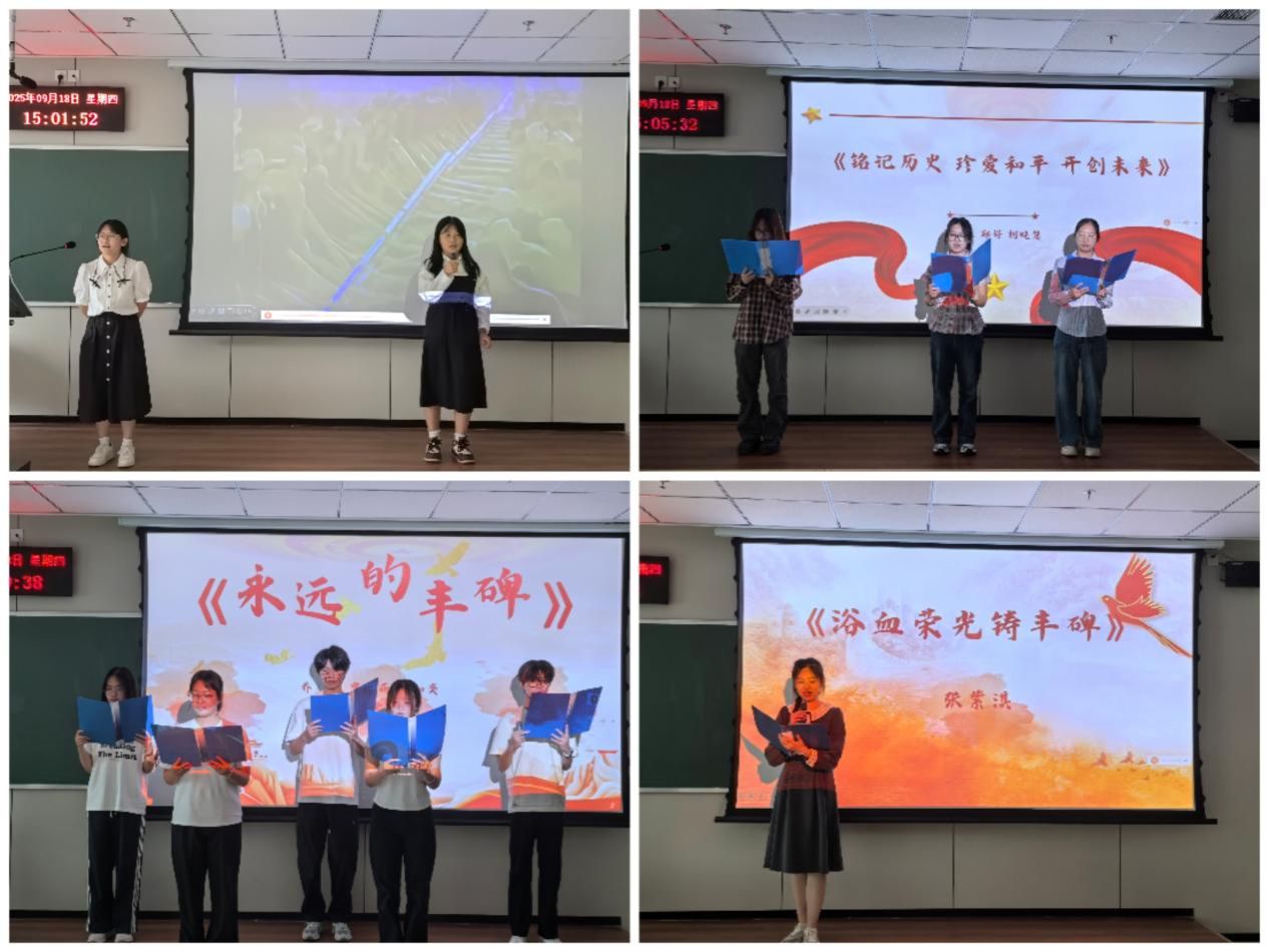 随后,来自学院各年级的同学们通过演讲、朗诵、演唱等多种形式,深情回顾抗战岁月,致敬英雄先烈。何思彤同学以《铭记历史昭日月,吾辈奋进继荣光》为主题展开演讲,情感真挚、铿锵有力;朗诵节目《跨越八十年的对话》《永不褪色的丰碑》《浴血荣光铸丰碑》等,通过声音与文字跨越时空,与英雄展开心灵对话;吴波翰、刘泓等同学的演讲深情讴歌抗战老兵的英勇事迹与初心传承;合唱《写你》则以歌声表达对和平的珍视与对未来的美好祝愿。最后,大家一同唱响歌曲《明天会更好》,清澈的合声、真挚的表情、挥动的红旗,传递出对和平的珍视、对未来的憧憬,也将现场气氛推向高潮,赢得阵阵掌声。