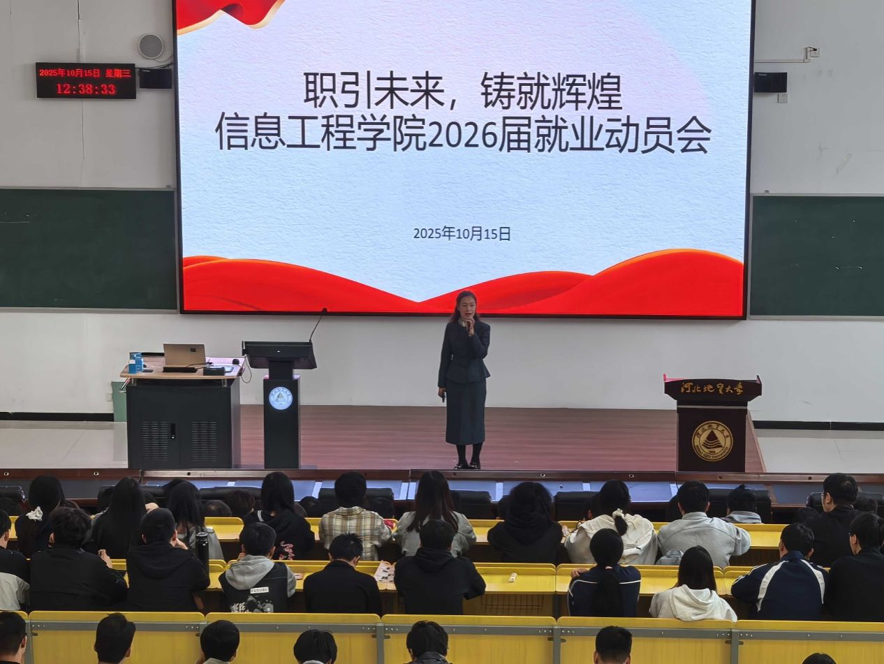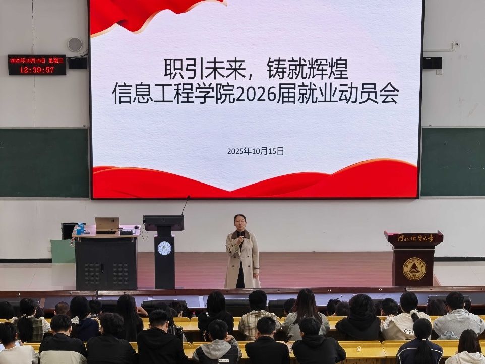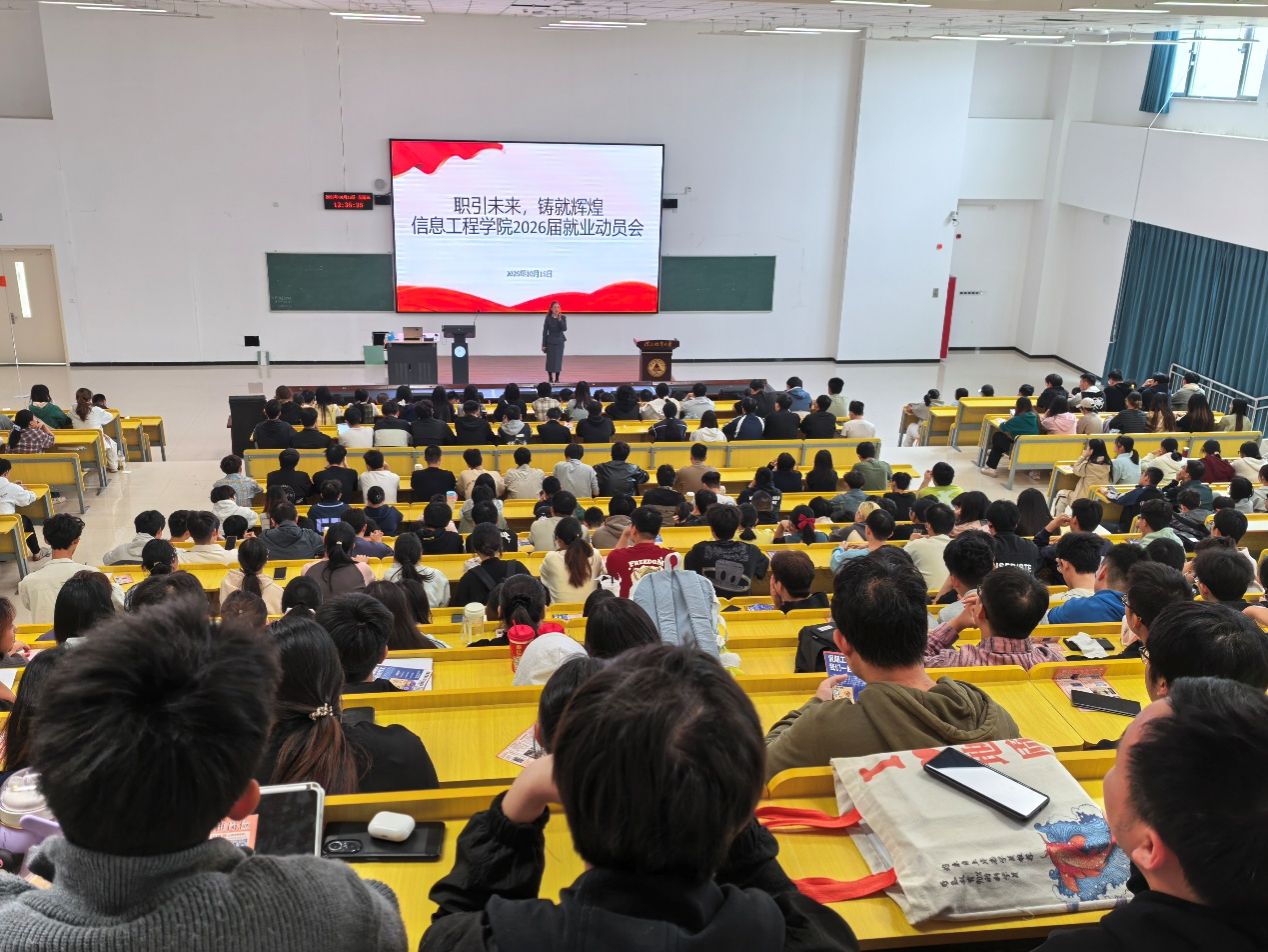 为切实做好2026届毕业生就业工作,帮助同学们认清当前就业形势,把握求职机遇,10月15日,beat365在线唯一官网登录信息工程学院隆重召开“职引未来 铸就辉煌”毕业生就业动员大会。学院党委书记郭宏、副书记贾佳、副院长赵占芳、26届辅导员陈皓天、张琦出席会议,2022级全体毕业生参加。