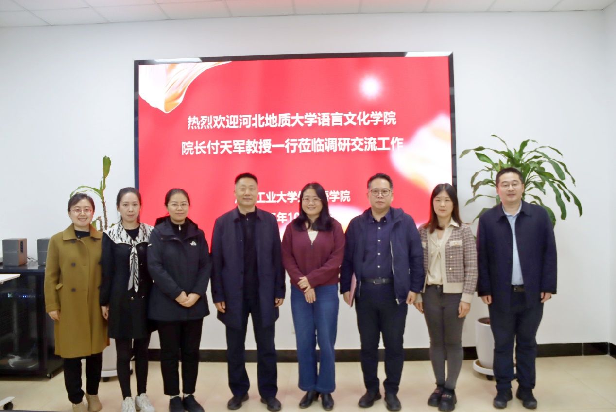 语言文化学院院长付天军、英语教研室主任陶沙、法语教研室主任柴立立及MTI中心秘书袁溢锾赴河北工业大学外国语学院考察交流。河北工业大学外国语学院院长石梅芳、副院长陈耀庭及相关教师热情接待付天军一行。座谈会上,双方围绕学院基本情况、学科专业建设、实习实践以及学术科研等方面进行了深入交流。两院领导表示,今后将进一步加强沟通与协作,持续推动在外语学科建设、科研合作、学生培养等领域的务实合作,共同促进外语教育高质量发展。