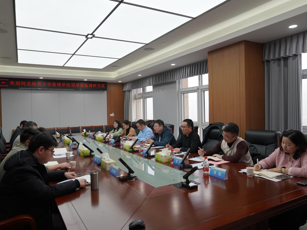 周雪对河北财华的热情接待表示感谢,并详细介绍了学校的发展历程、办学定位与特色,重点阐释了“服务地质行业、服务地方发展”的“双地”办学定位。她表示,管理学院将立足学校特色,发挥党建引领作用,积极对接行业与地方需求,推动产教融合走深走实。胡海川副院长围绕管理学院财会专业的学科建设、教学科研、人才培养及社会服务等方面作了简要介绍。