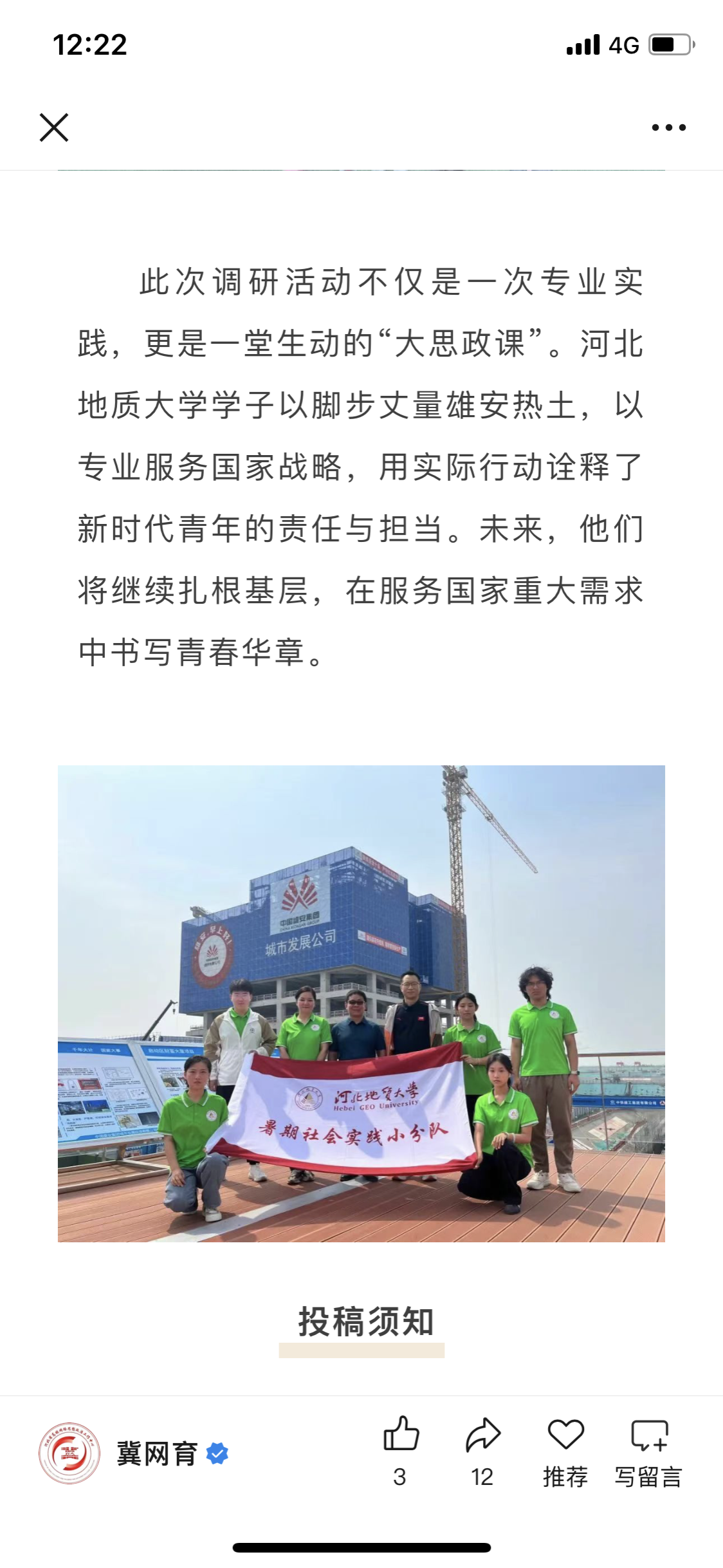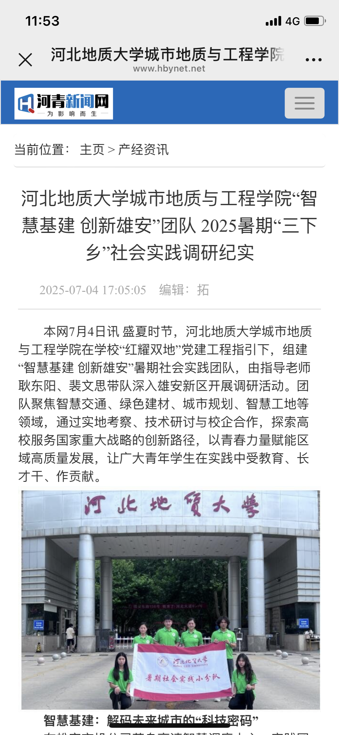 近日,由城市地质与工程学院团委组建的“智慧基建 创新雄安”团队,在耿东阳、裴文思指导老师的带领下,深入雄安新区建设一线,开展的一场聚焦智慧基建前沿、服务国家重大战略的实践调研活动引发广泛关注,新华网、今日头条、河北经济日报、河青新闻网等主流媒体相继报道。