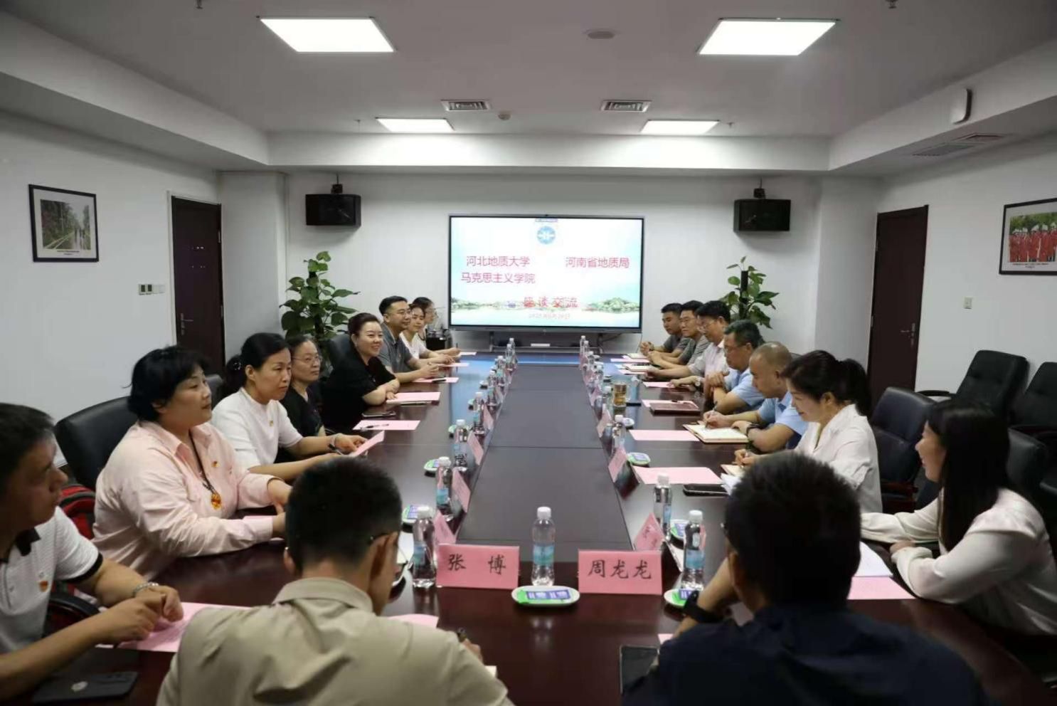 为深入贯彻中央八项规定精神学习教育,将学习教育与“培根铸魂、地质报国”结合,着力打造“资源共享、优势互补、互相促进、共同提高”的党建工作新体系,6月26日beat365官网马克思主义学院与河南省地质局,以“联学共建强作风 党建引领践使命”为主题,在河南省地质局开展党支部联学共建活动。河南省地质局地质环境处处长王道颖、办公室二级调研员周强、地质灾害防治处处长邵忠瑞等与beat365在线唯一官网登录马克思主义学院党总支书记吴聪聪、院长姚玉斐及双方支部党员代表参加活动。