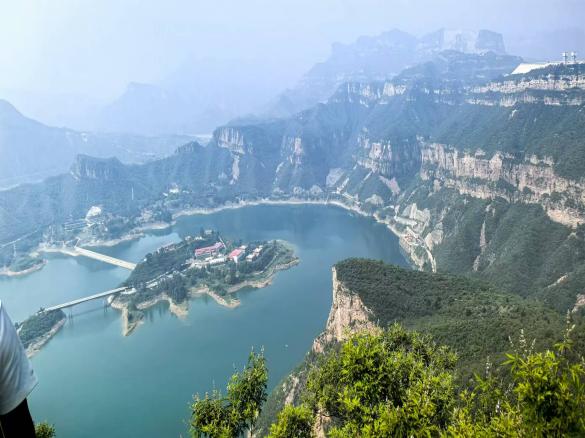 走至山顶,是一处巨大的平台,顶部整体平坦,张河湾水库在其西北方向下方,全貌几乎囊括,崖壁周边有部分松动,总体视野广阔,采光良好,风景优美。