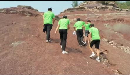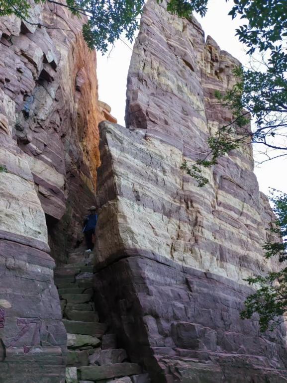 7月12日,小分队的队员们携带地质测量工具考查定盘寨(常州沟组为主)路线。走向巍峨的定盘寨,队员们拨开灌木,沿一条小路蜿蜒向上。在山腰处,坡度逐渐增加,攀登难度增加,碎石居多,路面不平整,存在部分松动,抬头向上可见铁质石英砂岩形成陡崖,队员们保持安全距离,稳步向上。
